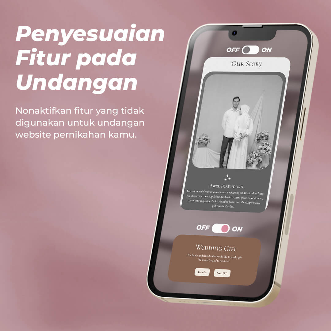 Serta fitur diundangannya bisa di nonaktifkan jika kamu tidak membutuhkannya seperti (Wedding Gift, Wedding Wish, Instagram link, Video Prewedding dan lain sebagainya).